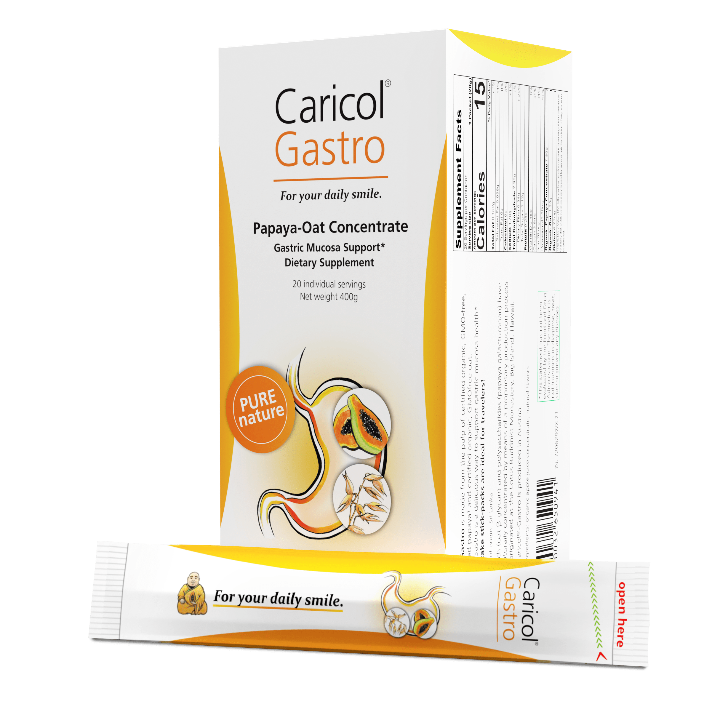 Caricol®-Gastro contains the valuable ingredients of Caricol®, a patented extract of tree-ripened organic papaya, and a patented organic oat preparation.